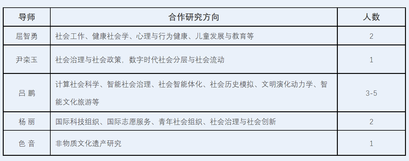 合作导师简介详见学院网站师资介绍专栏:https://soc.bnu.edu.cn/szdw/zzjs/js/index.htm。若对上述表格未列出的合作导师感兴趣,可提前与相关导师沟通确认招收意向后申报。
