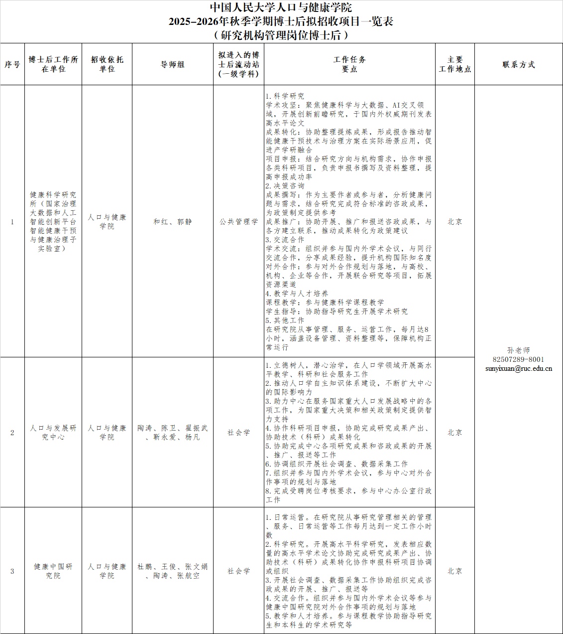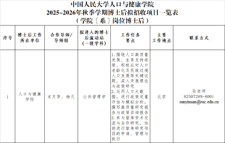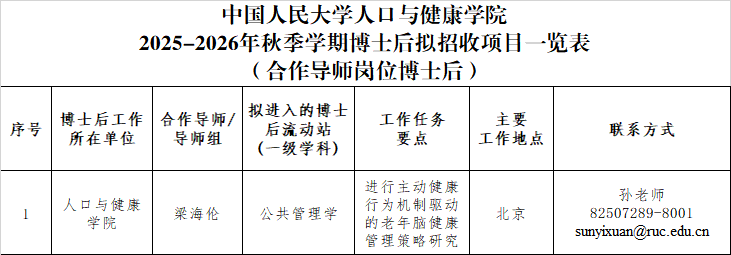 经学校批准,人口与健康学院将招收2025-2026年秋季学期博士后5名,从事人口健康、公共卫生方向研究,具体信息如下: