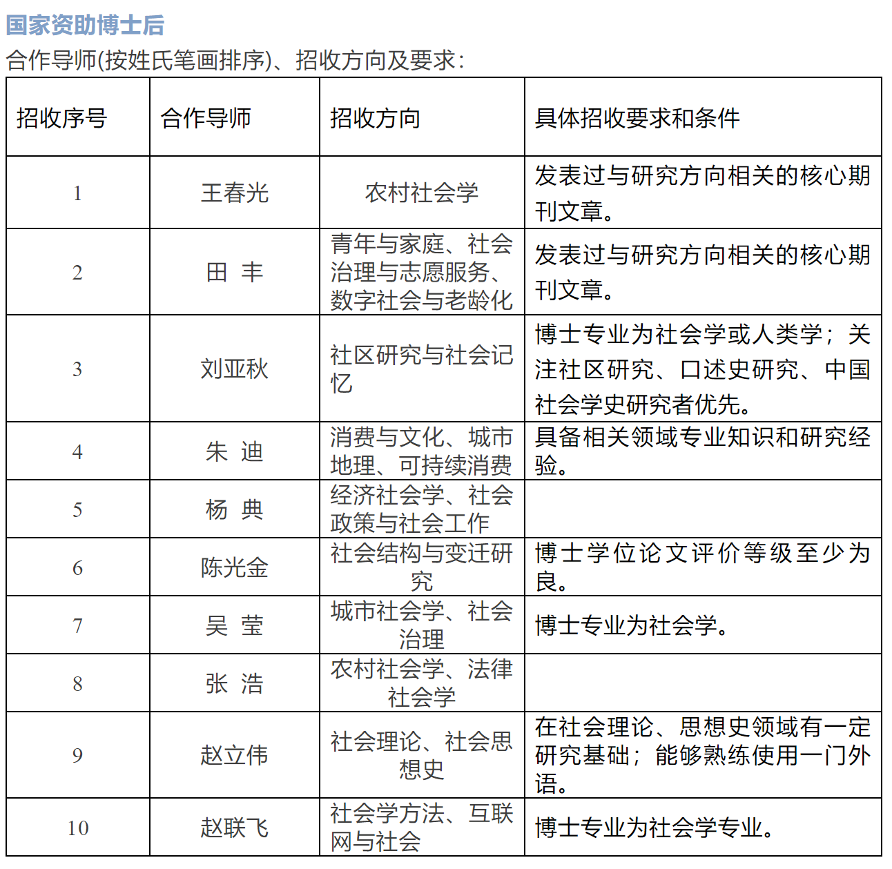 (四)在站期间须完成1部具有较高学术价值的博士后出站报告,并以“中国社会科学院社会学研究所”为作者单位,独著或作为第一作者、第二作者(博士后合作导师为第一作者)发表一定量的高质量成果。