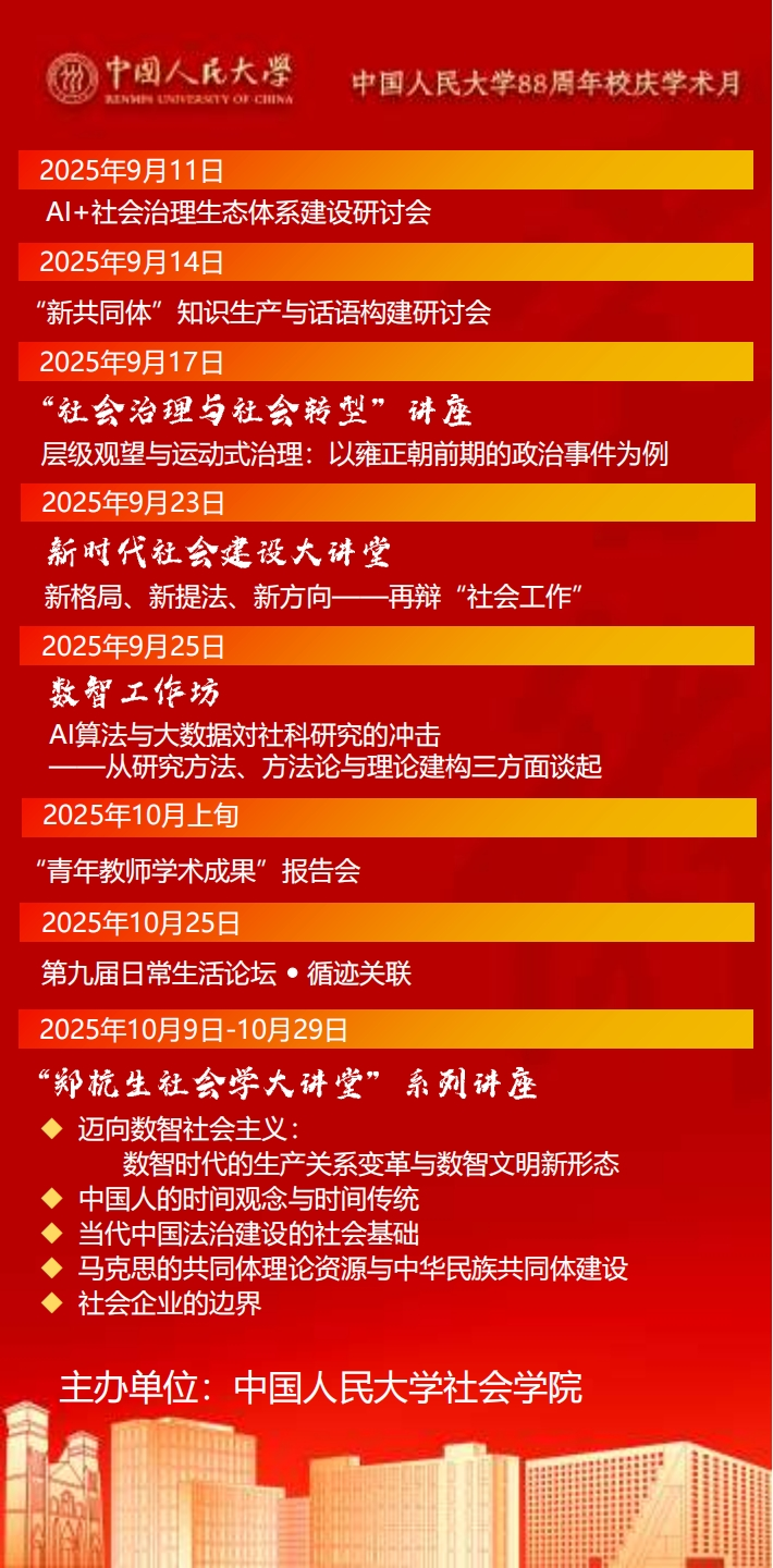 为迎接中国人民大学88周年校庆,中国人民大学社会学院将于2025年9月至10月期间开展校庆学术月系列活动,诚邀各位社会学同仁参与和支持!
