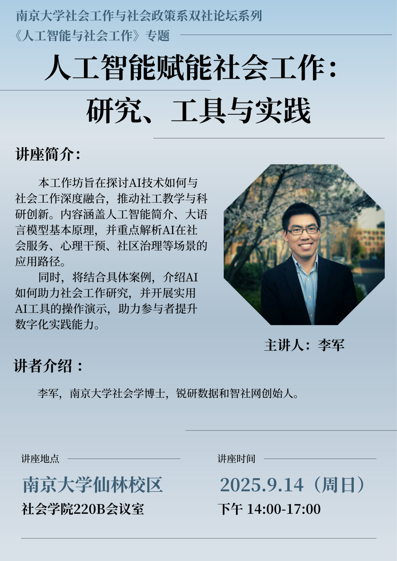 同时,将结合具体案例,介绍AI如何助力社会工作研究,并开展实用AI工具的操作演示,助力参与者提升数字化实践能力。