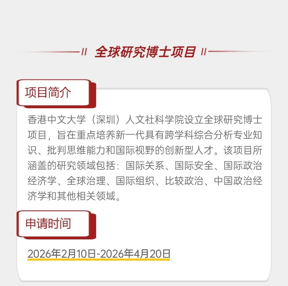 【申博】香港中文大学深圳人文社科学院2026-27人文社科学院博士项目第二轮申请开放