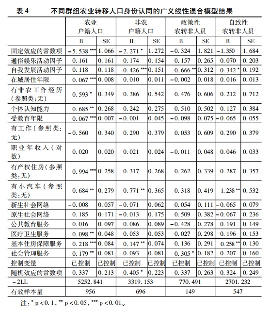 考虑到公共服务获取便利度对身份认同的影响存在户籍差异,本文将研究样本分为农业户籍样本和非农户籍样本加以进一步考察,结果见表4。不难发现,两类群体在身份认同上的差异除了体现在结构性因素上,还体现在受教育年限、产权住房、小汽车、城市生活方式(自我发展活动因子)、在城居住年限、非农工作经历、个体认知能力等个体因素上。具体来说,城市生活方式(自我发展活动因子)对身份认同的显著影响仅适用于非农户籍人口,其余因素则主要对农业户籍人口的身份认同存在影响。这表明,农业户籍人口身份认同在个体层面的差异更多体现在产权住房这种“累积性”的财富分化上,而那些已经实现户籍转换的个体其心理层面的身份融入更多地与追求自我发展的城市生活方式、价值理念等精神文化层面的因素相关,即不同户籍农业转移人口的身份认同遵循着不同的分化逻辑。