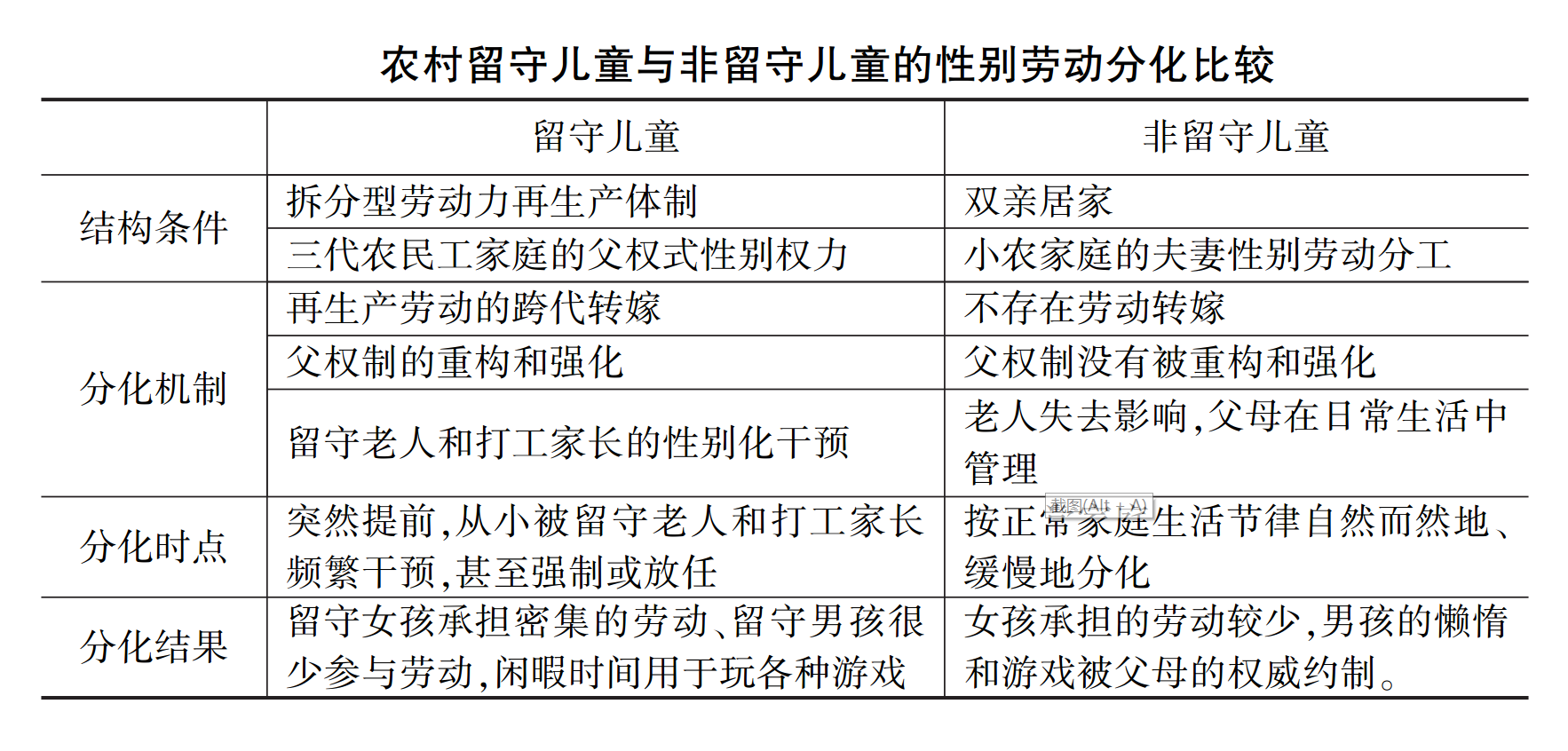 因此,对农村留守儿童而言,为应对家庭再生产劳动紧张,留守老人(尤其是女性老人)依据被强化的父权观念,通过日常干预、甚至责骂的方式将留守女孩导入密集的劳动轨道,却放任留守男孩的懒惰与游戏;打工父母(尤其是打工母亲)则通过频繁的电话干预和打工地团聚时的当面要求,强化留守儿童的性别劳动分化。与之相反,农村非留守儿童既不必面对家庭再生产劳动紧张的压力,又无需受留守老人的影响,女孩不必承担基本已被母亲承担的家庭再生产劳动,男孩的懒惰和游戏也被父母的日常管理有效约制。与留守儿童被突然提前、强制要求的性别劳动分化模式相比,农村非留守儿童的性别社会化只是在居家父母的日常管理下,按正常家庭生活的节律自然而然地出现,两者的性别劳动分化时点和结果因而存在根本差异(见下表)。