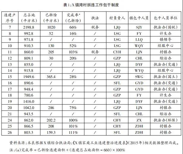 第二,土地执法的关键是要“下乡执法”,即执法力量入村。既有的研究都是讨论经济发达镇的综合执法,关心镇区的治理任务如何通过综合执法的方式解决。对于X镇来说,综合执法最主要的执法对象是乡村中的家庭工业。为此,X镇划分了11个责任区,派驻镇综合执法局的工作人员驻村工作。比如湾村执法片组就负责湾村、桥村和庄村三个村的行政执法。在拆违行动的高峰时期这个执法片区有5个工作人员,分别来自税务、交通、国土、环保四个县直属部门。