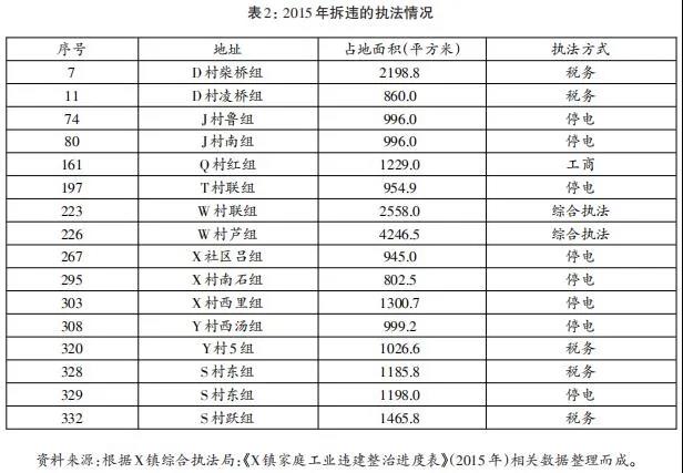 2015年X镇共计拆除365户违建面积为660平方米以上的建筑,其中大部分都是通过做宣传说服工作以后农户自行拆除的,但是也有16户是通过“执法”的方式处理后才拆除违法建筑的。表2详细呈现了土地执法的具体过程。具体来看,这些执法手段包括税务执法(5次)、工商执法(1次)、停电(8次)、综合执法(2次,强拆),其中比例最高的居然是停电。