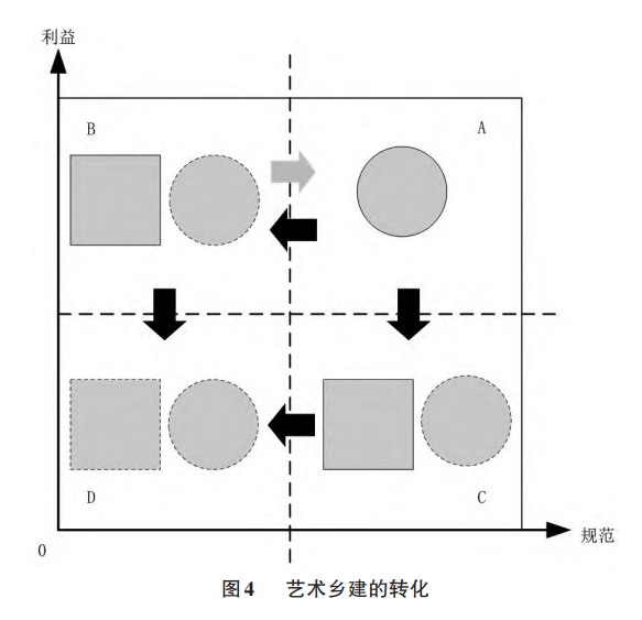 (1)从艺术乡建到其他:转化、重启与失败。如果理想熏陶受阻,满足于现实收益的村民将停滞在B区域。随着项目运营的现实压力不断增大,艺术家将不得不考虑妥协价值规范,逐步追求现实收益(B区域),成为村民的利益合作伙伴(见图4)。内含“利益-规范”双重目标的艺术乡建将蜕变成文化创意经营(“艺术家B+村民B”)。事实上,相当数量的艺术乡建已经陷入了这种“名实分离”的局面。
