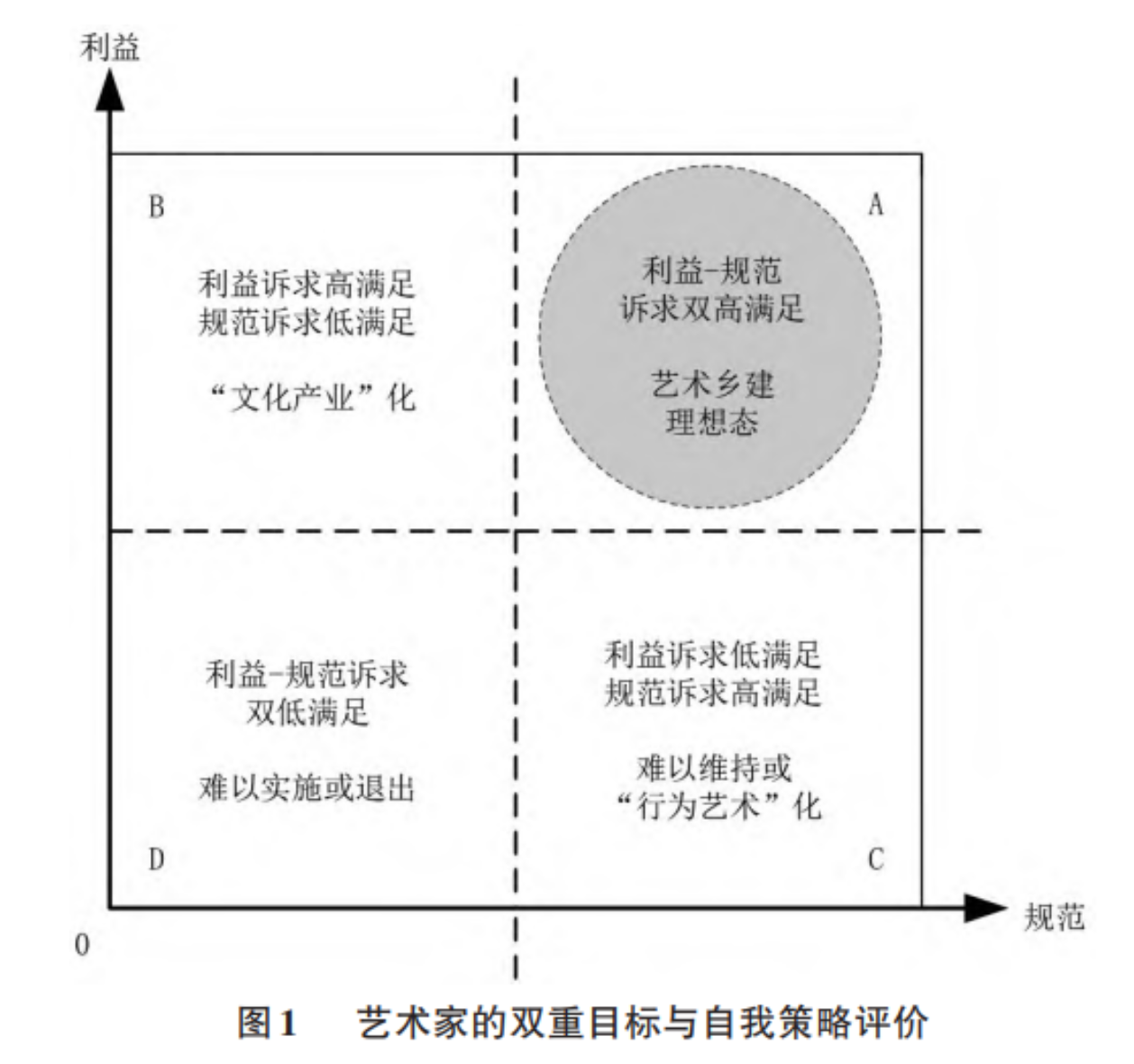 据此可以建立一个简化分类模型,用以描述乡建艺术家的“利益-规范”双重目标与自我策略评价(见图1)。图中横、纵轴分别代表(项目整体或某个具体操作对)艺术家价值规范和现实利益诉求的满足程度,A、B、C、D象限构成了四种典型状态类别。