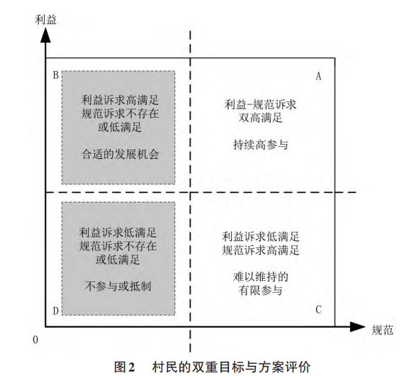 类似的,我们可以建立一个简化分类模型来描述艺术乡建涉及的村民的“利益-规范”双重目标与方案评价(见图2)。考虑到村民存在更明显的(价值规范)偏好改变可能,下面的分析将略微复杂。