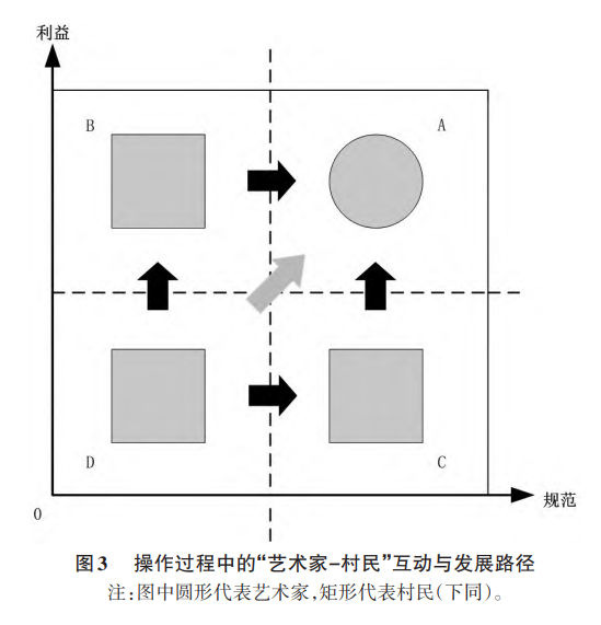 坚持艺术乡建的基本属性,意味着艺术家要保证方案始终处于自己双重满足的A区域,操作阶段的重点是如何满足村民的既有利益目标,同时激发并满足他们的潜在规范诉求。下面将对两条常见的完整路径展开说明(见图3)。