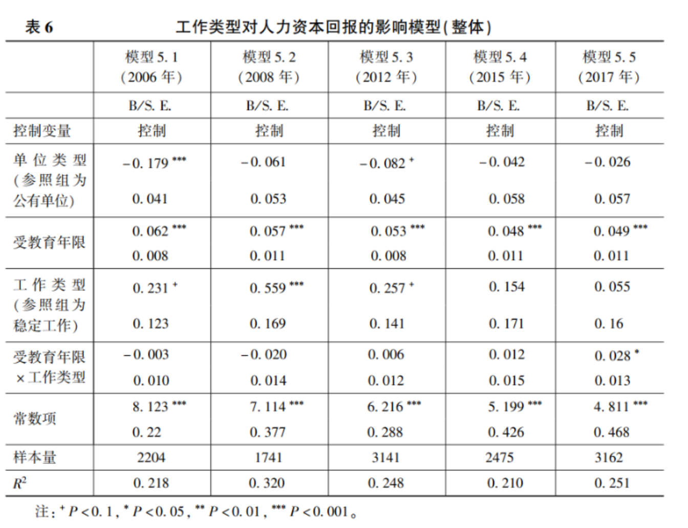 检验劳动力市场二元分割结构的另一个标准是分析两种劳动部门的资源分配机制是否一样,其中人力资本回报的差异是最主要的区分指标。模型5在模型2的基础上加入工作类型与受教育年限的交互项。表6结果显示,模型5.1-5.4中工作类型与受教育年限交互项系数不显著,说明稳定工作者的教育收益率与不稳定工作者相似;模型5.5中工作类型与受教育年限交互项系数变得显著为正,说明稳定工作者的教育收益率显著高于不稳定工作者。