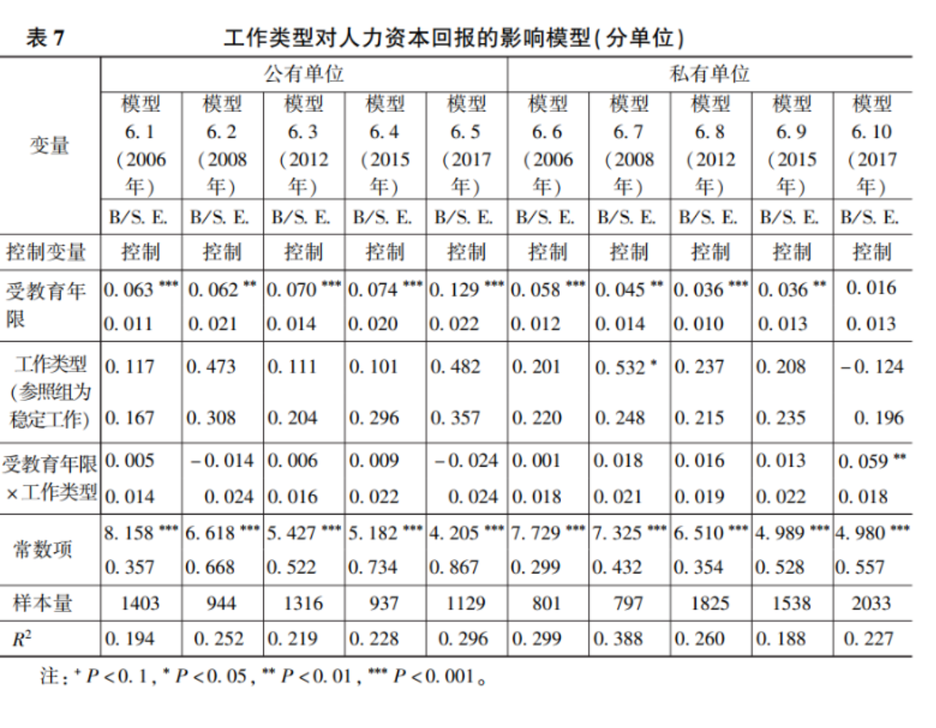 最后,模型6在模型3基础上加入了工作类型与受教育年限交互项。从表7结果可以看到,在模型6.1-6.5中,工作类型与受教育年限交互项系数始终不显著,说明公有单位内稳定工作者的教育收益率与不稳定工作者是相似的。在模型6.6-6.9中,工作类型与受教育年限交互项系数也不显著,但在模型6.10中,该交互项系数变得显著为正,说明稳定工作者的教育收益率显著高于不稳定工作者。再来看模型6.6-6.10中受教育年限系数的变化,可以看到受教育年限系数逐渐减小,到2017年甚至不显著,这说明不稳定工作者中的教育收益率在逐渐下降,而这可能造成了其与稳定工作者之间教育收益率差距的扩大。