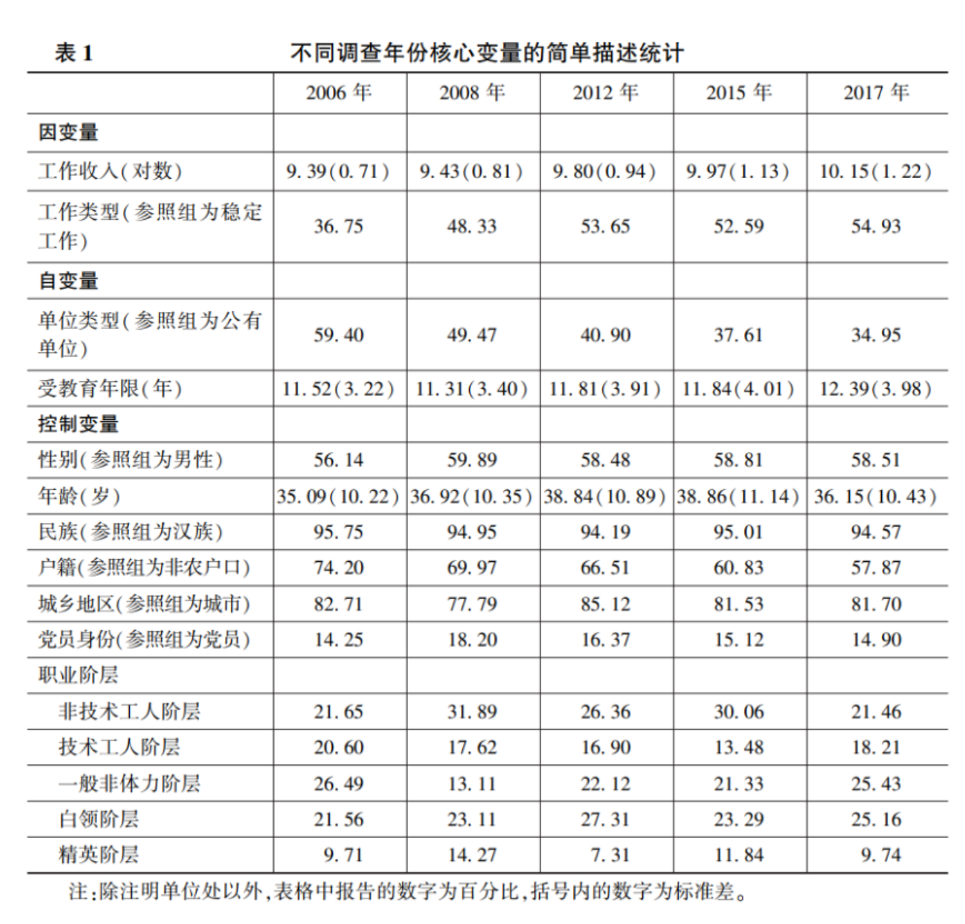 本文的因变量包括两个方面:一方面,在分析劳动力市场中稳定化趋势时,因变量是工作类型,即是否为稳定工作。对于不稳定工作的界定,不同学者使用的标准往往不同。本文主要根据工作时间与契约关系来界定。如果被访者的工作不是全职工作,或者没有固定雇主(临时工),或者有固定雇主但未签订劳动合同,则界定为不稳定工作,设置为0,其他工作视为稳定工作,设置为1。