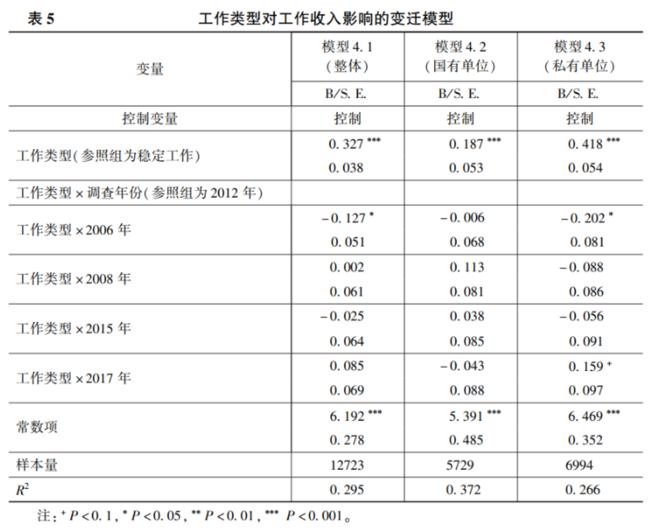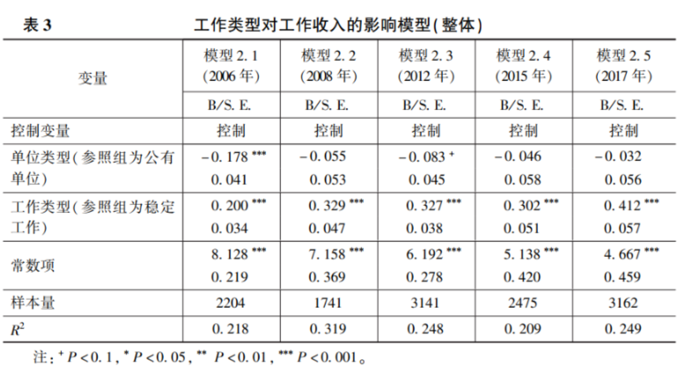 假设2.1:稳定工作者的平均收入高于不稳定工作者,2008年后,二者收入差距扩大。