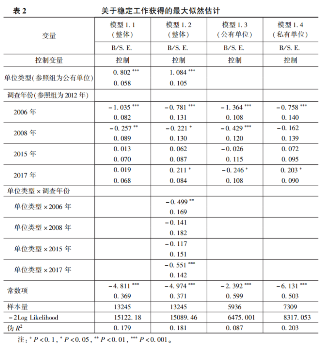 模型1.3和模型1.4分别分析了公有单位和私有单位内部稳定工作获得的变化。模型1.3显示,相比于2012年,2006年、2008年和2017年的系数都显著为负,但2017年系数值较小,说明从2006年到2012年,公有单位内部稳定工作迅速扩散,此后则略有下降。模型1.4显示,2006年系数显著为负,不过系数绝对值小于模型1.3,这说明从2006年到2012年,私有单位中的稳定工作扩散速度不如公有单位快。不过与模型1.3不一样的是,在模型1.4中,2017年系数显著为正,这说明从2012年到2017年,私有单位中稳定工作在持续扩散。