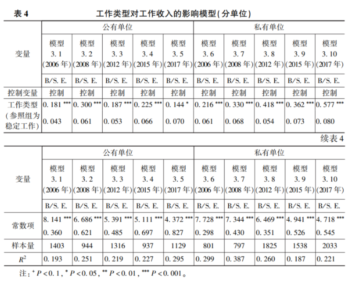 模型3分别分析了公有单位和私有单位内部工作类型对收入影响的变化。模型3.1-3.5分析的是公有单位情况。表4结果显示,工作类型的系数均显著为正,但从表5可以看到这些系数没有显著变化,说明在公有单位内,稳定工作者的平均收入始终高于不稳定工作者,但二者的收入差距并未随着时间而显著变化。模型3.6-3.10分析的是私有单位情况,从表4可以看到工作类型的系数也都显著为正。表5结果显示,与2012年相比,2006年工作类型系数显著更小,2017年工作类型系数显著更大,这说明在私有单位内,稳定工作者的平均收入始终高于不稳定工作者,而且二者的收入差距在2006-2017年逐渐扩大。