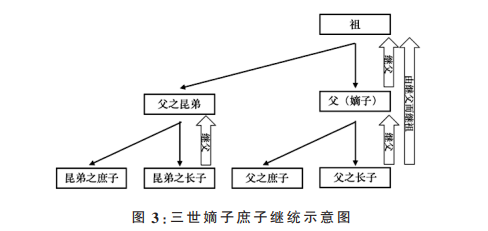 郑注第一句所说的“此言为父后者”,是直接解释经文中的“父”字,意思是说,“父为长子”中的“父”本身是一个“为父后者”。换句话说,经文所说的父为长子制斩衰服是有条件的,并不是所有的父都要制斩衰之服,需要有一个特别重要的前提,即父同时也是一个长子,有资格传父之父(也就是长子之祖)的重(可被理解为牌位,即父有资格祭祀其父)。倘若父没有承其父的重,父之长子也就不会祭祀其祖,那么,父也就不为长子服斩了。所以,传文“庶子不得为长子三年,不继祖也”(郑玄、贾公彦,2008:885),这句话转译成“庶子(父之弟)不得为其长子三年,这是因为庶子不继其父,庶子之长子也不继其祖”就更容易理解了。这里的“继”,就是有没有资格祭祀(“传重”)的意思。换句话说,“父之父—父—父之长子”一共三世,后两世都必须是嫡子。在这种情况下,父继其父,长子则既继其父,又继其祖。相较而言,“庶子不得为长子三年”也可以看作“父之父—父之昆弟—昆弟之长子”三世,只有第三世的昆弟之长子是嫡,父之昆弟不继其父,而昆弟之子则继昆弟。我们假设第一世的祖是一人,祖生二子,父与父之昆弟、父与父之昆弟各生二子,便可以表示为图 3。
