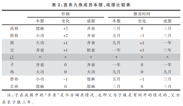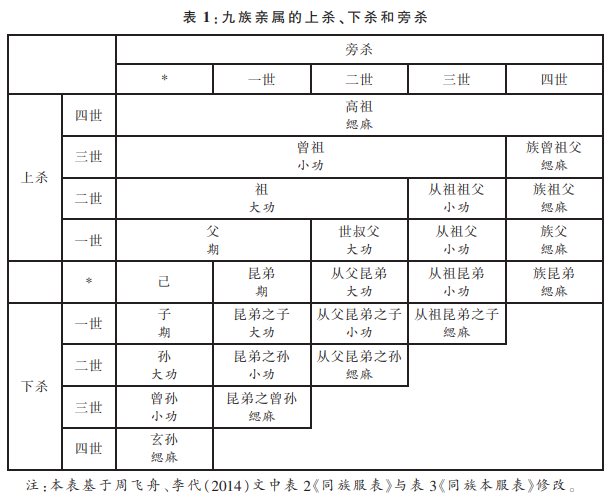 以己的直系九世亲属为轴,表 1每一个实线列中的成员都表示有一个不同世数的共祖的关系。从己出发,如己之曾祖以下与己之族曾祖(曾祖的亲兄弟)有共高祖的关系;己之祖以下与己之从祖祖父(祖之亲兄弟)有共曾祖的关系,以此类推。所谓的“上杀”“下杀”,也仅指己之直系,除了“己”这一列的所有直系成员,对其余亲属的服制都可以叫“旁杀”。