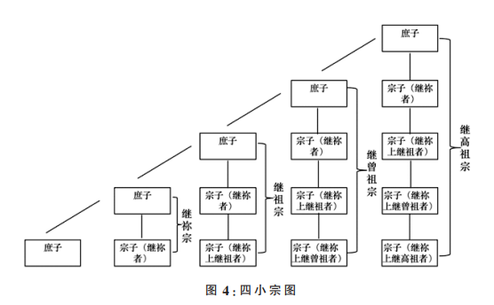 从图 3就会看得很清楚:一代的“祖”生嫡长子“父”与庶子“父之昆弟”,二者各自有子之后便“异居”,父之昆弟如果家有余财,则归于父,不足则父资之。财归于父的原因是因为父继祖,这就是所谓的事“继祢小宗”。“继祢小宗”的意思就是,作为嫡子的父因继其父而成为继祢宗之宗子,作为庶子的父之昆弟,因尊其父而尊其兄。到了第三代,父之长子仍然继祢,同时因为父本身是继祢(长子之祖),故父之长子在继祢的同时也继祖,这就是所谓的“继祖小宗”,父之长子就是继祖宗的小宗子。与长子同辈的兄弟包括己之昆弟和从父昆弟(也就是父之昆弟的长子与庶子),同样因为第一代的祖是自己的正尊,出于尊祖的缘故,而事继祖的长子,这就是“继祖小宗”。简言之,在图 3中,从一代到二代,父因继祖而成继祢宗并率其昆弟;从二代到三代,最右侧的从祖到长子的这个世系就是继祖宗,率其昆弟与从父昆弟,也包括父之昆弟(庶子)之长子,在这一世形成的新的继祢小宗。亲亲之道五世而竭,最远能溯及高祖,所以图 3也可以继续上溯。最右侧的世系,如果祖也是嫡子而继曾祖,那么到父之长子这一代就是四世,而三世为嫡,嫡嫡相承,正体而下,父之长子就是继曾祖宗。同理,如果曾祖也是嫡子,父之长子就是继高祖宗。长子之高祖是不是嫡子并不重要,因为五世而迁,高祖那一代的宗到了长子这一世就没有了。以上便是周代宗法制度中的“四小宗”(见图 4)。周代又有大宗,不过小宗和大宗背后的道理都是一致的,都是以“嫡庶制”为组织原则,也都是通过“嫡嫡相承”的方式得以存续。关于周代大宗的意义,需专门撰文讨论,本文不再赘述。