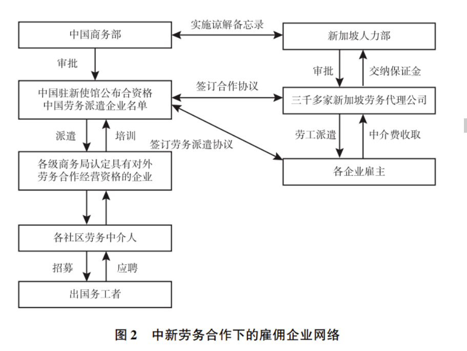 新加坡的国家对外劳务合作规制与日本的相似之处在于严格规范劳工输入数量、种类及其输入后的管理,其区别在于对能够输入外劳的企业和从事输入业务的劳务公司的资格不作严格限制。雇主只要证明他们需要外国劳工,且雇佣的外国劳工不超过政府规定的公司外籍劳工与本地工人的比例,外国劳工的国籍符合政府的规定,即可提出外籍劳工雇用申请。新加坡国内的劳务公司都可以从事国外劳工输入事务。但如果输入中国劳工,则只能与中国驻新大使馆列出的中国政府认可的劳务公司合作;而中国商务部则规定只有市级以上商务局审批的劳务公司才能经营中新劳务合作项目。这样,新加坡的劳务公司与中国的劳务公司就形成直接对接关系,中新劳务合作的企业网络比中日的网络层级少,中间没有非政府组织(见图2)。这个简图把相关企业网络水平关系简化了,只留下了垂直关系。更多细节可参看图1。