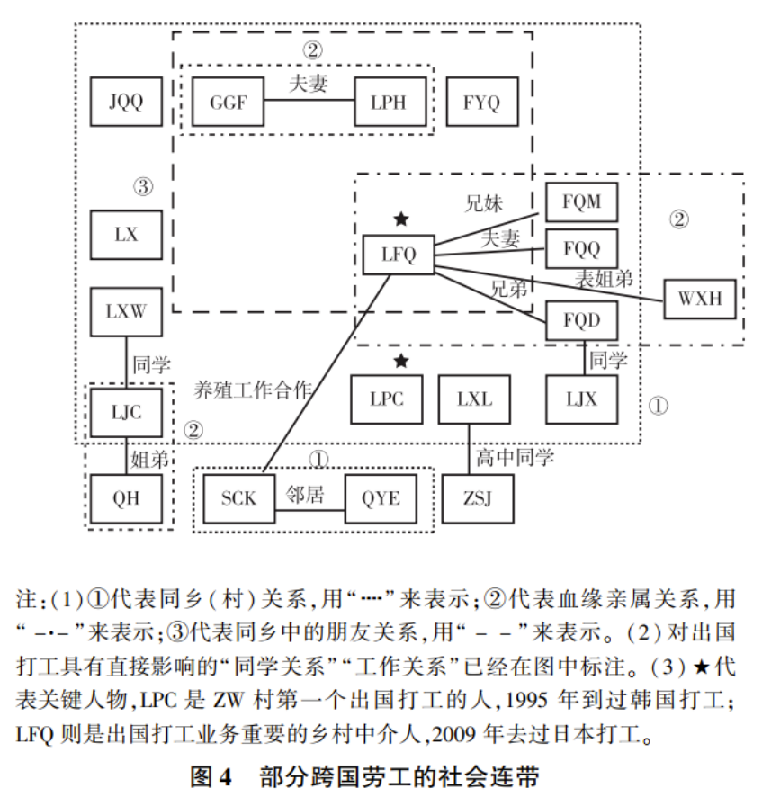 图4描绘的是北县安镇出国务工者密集的居住分布和相互关系。图中列出的19名跨国劳工中有3人(QH、LJC、LXW)去新加坡打工,剩下16人去日本打工,其中LPC还去过韩国打工。个人网与出国务工人群的显著关联体现在派遣劳工的地区分布上。