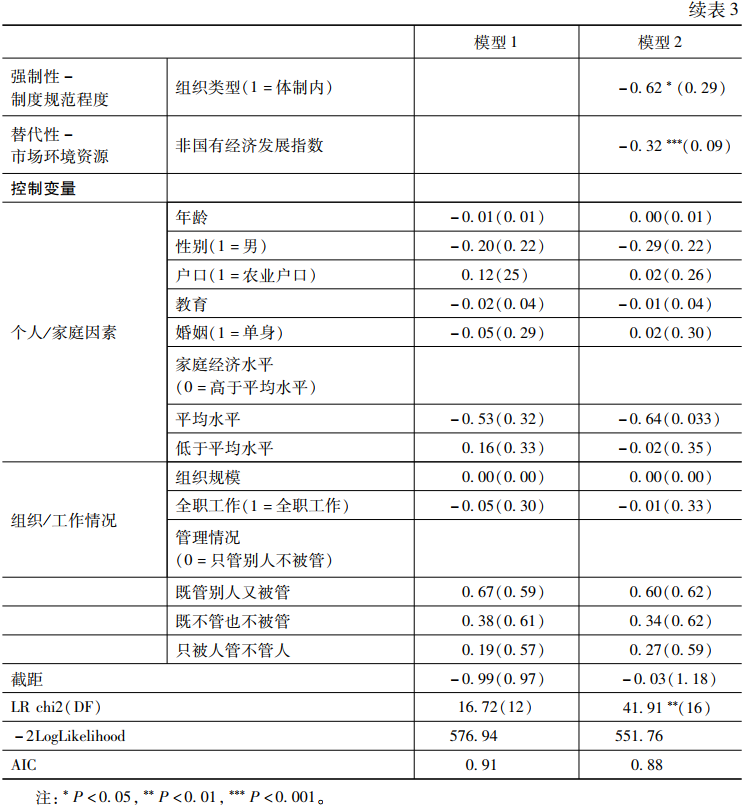 就权力“强制性”受制约程度而言,结果显示,雇主所在组织类型是体制内还是体制外对侵害发生率有显著的影响。与体制外组织的雇员相比,体制内组织的雇员受到侵害的几率减少了近一半(e-0.62-1="-0.46),这为假设2提供了支持。