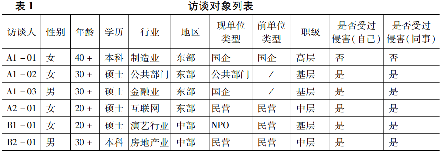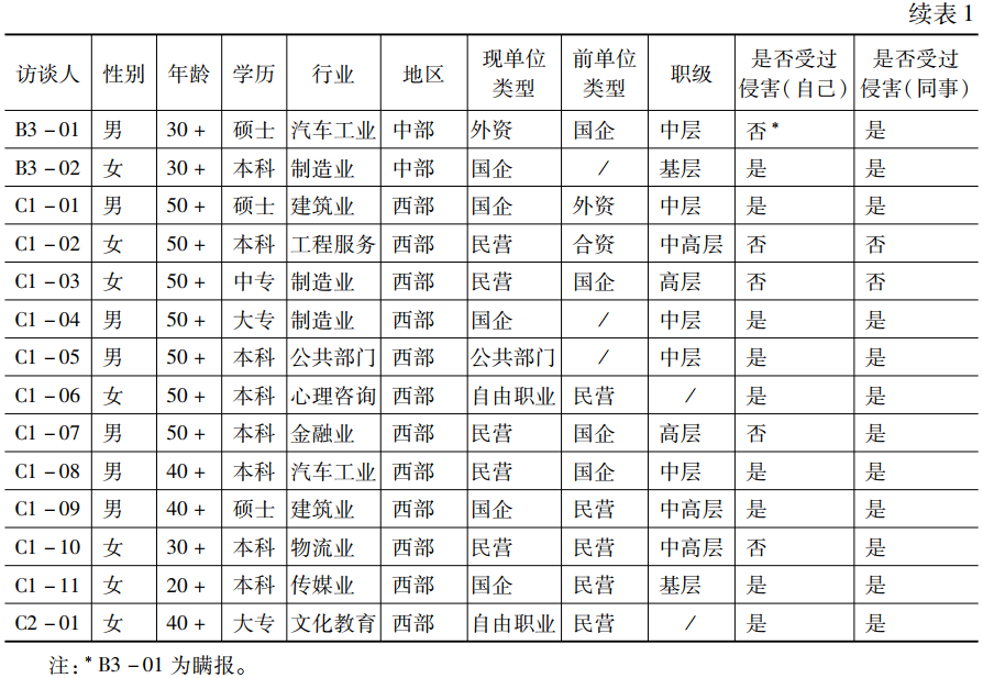 (1)定性数据。笔者在2021年1月到6月之间,对年龄在25岁至59岁、至少有五年工作经验的男性/女性进行了访谈。访谈对象分为两个来源,一部分是笔者之一在两个不同性质的企业以实习生身份进行参与式观察时结识的。其中一个企业是位于J城的、拥有6万多员工的某大型国企;另一个企业是在Z城的、员工数量超过10万人的某互联网公司。另一部分被访者则是在个人网络的帮助下通过滚雪球的方式获得的。在访谈对象的选择上,为了获得更具深度的资料,笔者优先选择那些在工作中有过被侵害经历的访谈对象。此外,访谈研究力求在地区(东、中、西部7座不同城市),单位类型(公共部门、国企、民营企业、外资、自由职业),职级(基层至高层),教育背景(中专学历至硕士学历)和行业(金融、制造、传媒、物流、互联网、文教等)等方面保持案例的多样性。由于研究话题在部分受访者看来属于个人隐私,涉及内容敏感,最终接受完整访谈的被访者为20人。
