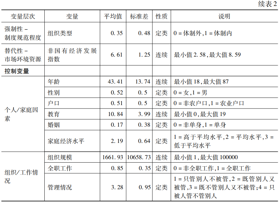强制性反映的是组织在多大程度上能够对强制性权力进行监督和制约。我们用雇主是体制内[党政军队、国有(控股)/集体(控股)企业]还是体制外组织[私有/民营/港澳台/外资企业、无单位/自雇(包括个体户)]来测量。