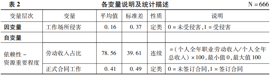 (1)因变量。本研究的因变量为“工作场所受侵害”,在CGSS2015中有这样一道题目:“过去五年,您在工作上是否被上级或者同事侵害过?例如:受过欺负,或者身体及心理上的伤害?”,该题通过雇员自我报告的方式来收集工作场所受侵害的信息,由于调查工作场所侵害问题具有相当的敏感性,加上国内对于工作场所侵害的重视尚不足够,该问卷中明确涉及此话题的只有这一个问题。剔除回答“不适用”和“无法回答”的观测值,将回答“是”者赋值为1,回答“否”者赋值为0,从而形成测量“工作场所侵害”的二分因变量。