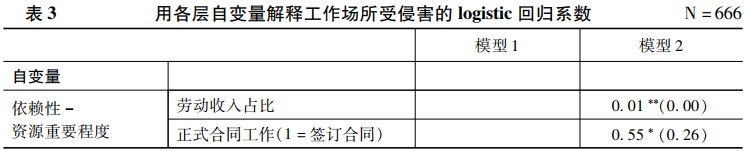表3报告的是工作场所侵害影响因素的logistic回归模型的结果,模型1只包括了控制变量,模型2加入了自变量。
