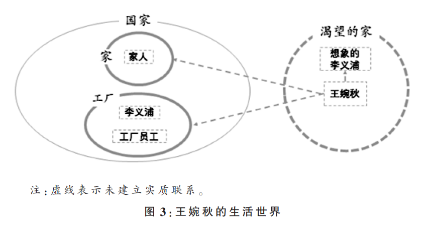 以此为背景,便不难理解王婉秋为什么会有背叛工厂的举动了,主要是因为她已经被一种基于对家的渴求而产生的对具体的人的爱恨所主导。遗憾的是,以家为意义的王婉秋最终也没有获得实体意义上的家。因为家是由具体的人及其相互关系组成的,就像宝珠对于家的深情厚谊,她以家为意义的实践真实地落在三福和婆婆身上的,是一种双向而具体的情感和社会联结。王婉秋对李义浦的爱慕之情却没有转化为两人之间实在的社会关系。王婉秋离开了自己原先的家,由于个体漂泊的痛苦,对家的渴求又过于强烈,以至于倾轧了对李义浦的爱慕之情,最终导致她对于家的情感只能单向寄托于由自己建构的抽象理念的“家”。在王婉秋生活世界的结构(参见图3)中,虽然她的自我个体已经出现,但并没能在这一基础上确立包括家庭与外部世界在内的整体的生活世界结构。