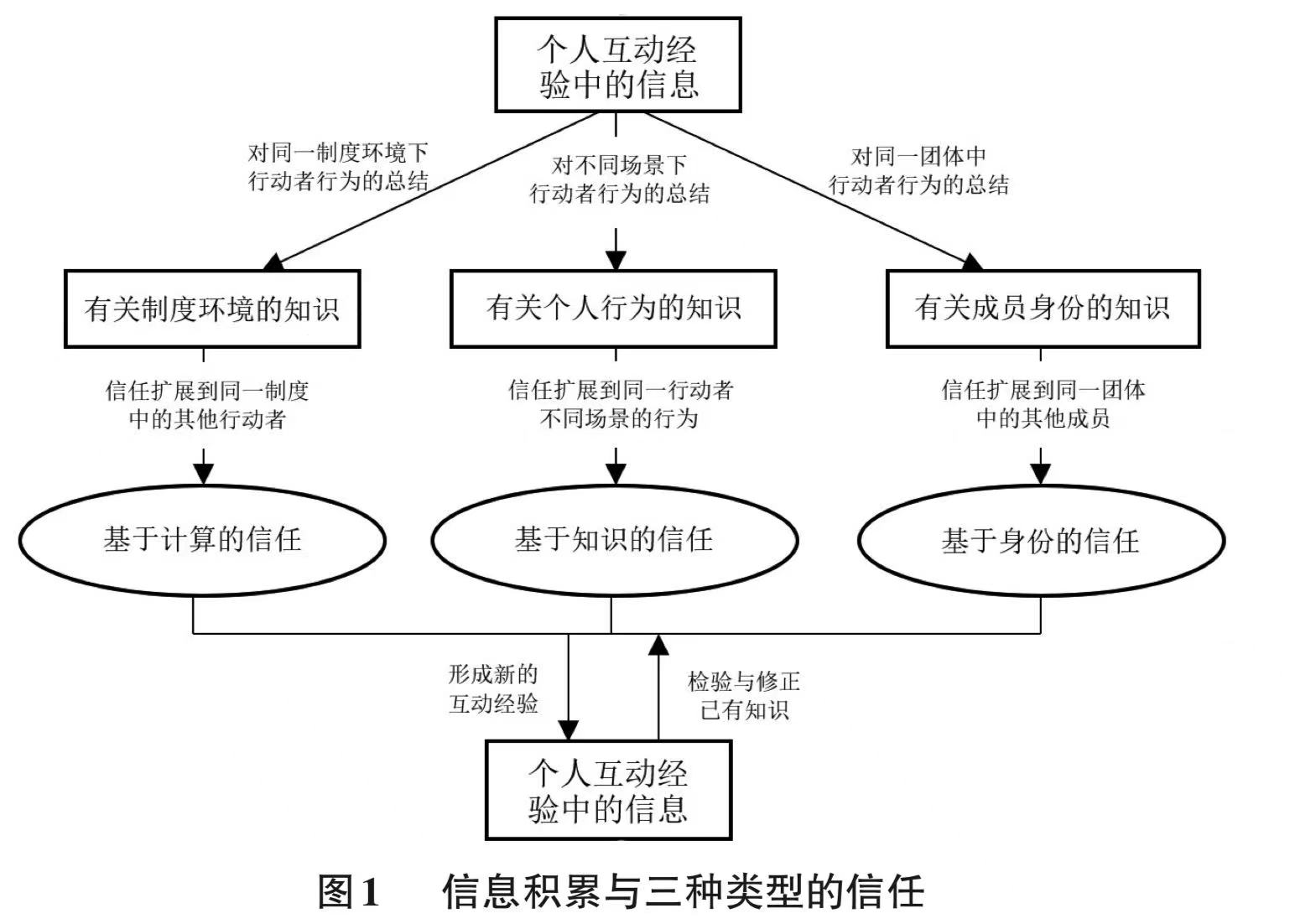 不同类别的信任不仅仅源于日常生活的经验,同时也不断形成新的经验。正如邓公所言,“实践是检验真理的唯一标准”,这些新的经验成为人们检验修正其对制度环境、个人品性、成员身份的认知的重要依据。信息积累与不同类别信任之间的关系可见图1。