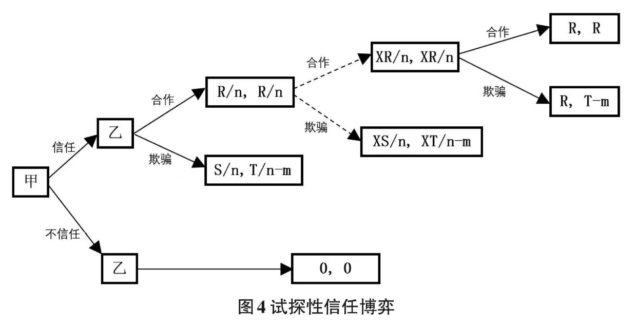 我们可以对图3的信任博弈略做修正(见图4),以理解风险渐进的内在逻辑。图4加入了若干次(n-1次)试探性博弈。这相当于对总体环境风险T- R进行了n等份的分割。在第一次博弈中,甲所面临的环境风险是(T-R)/ n。此后,每一次博弈都比上一次增加一定量的风险(T-R)/n,到第X次时即是X(T-R)/n。在重复博弈中,甲会一直信任乙,直到乙欺骗自己。