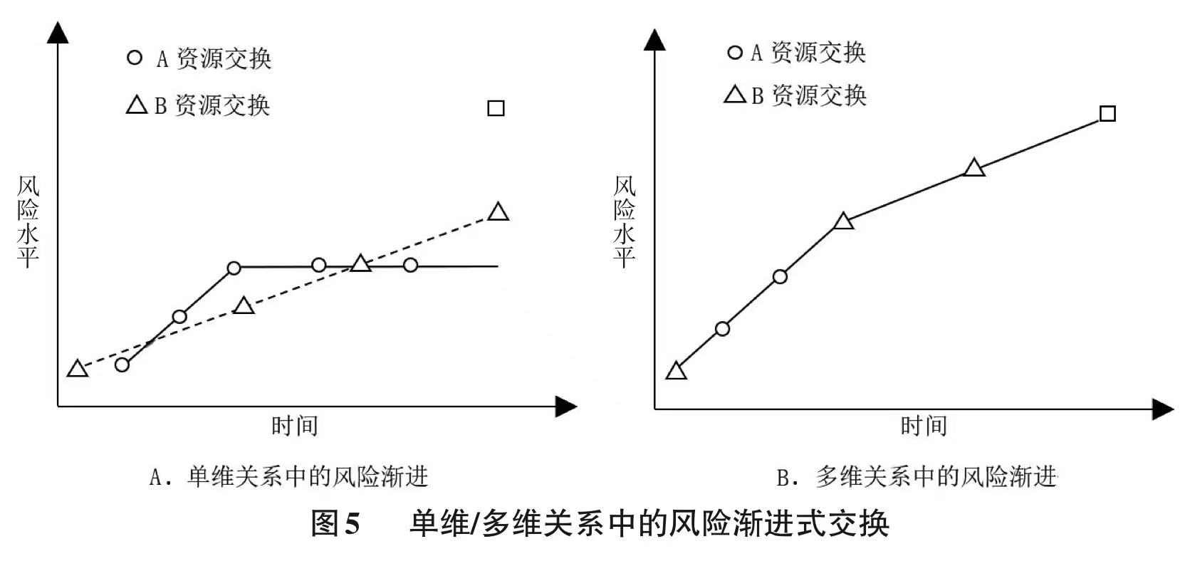 图5的纵轴代表风险水平,即资源交换水平;横轴则代表时间。当双方只存在某一类资源交换时(图5A),或是渐进条件受限(A资源),或是积累条件受限(B资源),因此在固定时间内都无法积累充分的信息以进行高水平的合作(图中方块所示)。而当双方之间同时存在两种资源的交换时(图5B),在保持每次交易风险增量不变的情况下,高频次的A资源交换与可持续渐进的B资源交换相互补充,最终使行动者之间积累起充分的信息以进行高风险的交易。