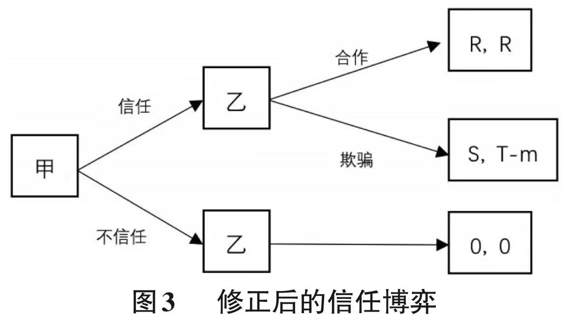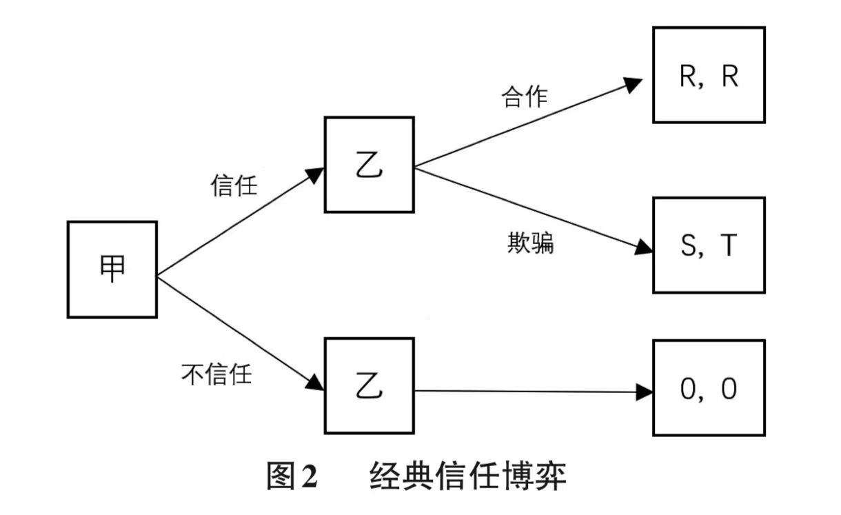 在图2中,甲是信任者,乙是受信者。如果甲不信任乙,则双方没有合作,收益都为0。当甲选择信任乙且乙选择合作时,双方收益都为R。而当乙选择欺骗甲时,乙获得可能的最大收益T,而甲则得到最小的收益S,即T> R>0>S。在经济人假设下,乙会为了获得最大的收益(T)而必然欺骗甲,而甲为了避免获得最小收益(S)则从一开始就不会选择信任乙。在这个框架下,行动者的决策行为(信任/不信任,合作/欺骗)服务于其获取最大经济利益的偏好。环境中的风险在这里体现为T与R的大小关系:T-R越大,乙受到的诱惑就越大,甲信任行为的风险也随之增加;反之,则风险越小。在经济学中,解决信任博弈困境的关键就是改变乙的收益结构,即T-R的取值。通常的策略是让甲乙重复进行博弈。如进行n次博弈,其间只要乙欺骗了甲,那么甲就终止与乙合作。那么,当乙采取欺骗策略时,他的收益即是第一次的欺骗所得T;而当采取合作策略时,其收益则为nR。当n足够大,使得nR>T时,乙就会合作。因此,在重复囚徒博弈中,即便在自私自利的人之间也会产生出合作的秩序(阿克塞尔罗德,2007)。