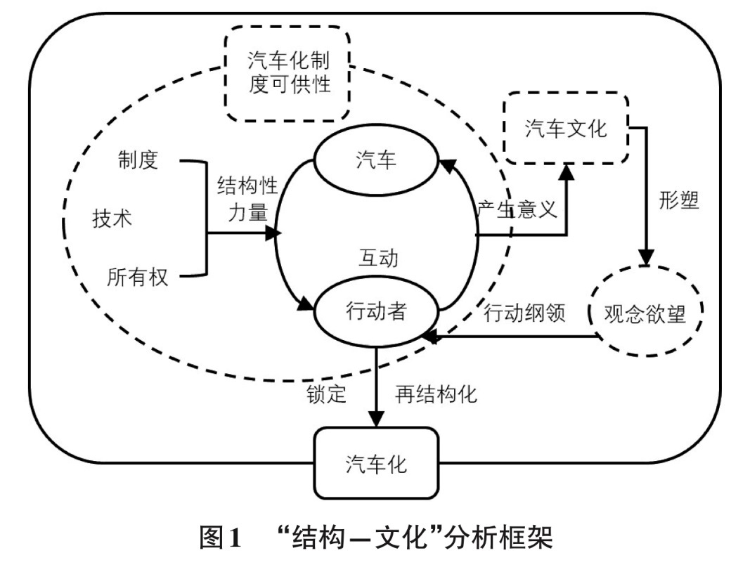 汽车化概念体现了一种结构与文化的互动关系,暗含了“结构二重性”的逻辑。一方面,汽车化制度所提供的汽车技术、生产能力、制度安排、产业政策、消费和所有权模式、道路系统及法规等刚性的制度结构,可以归纳为汽车化制度可供性,它框定了行动者与汽车以及通过汽车与其他人或事物互动的行动边界。另一方面,汽车日常使用(互动)的外部性塑造了特定的汽车文化,人们通过汽车文化形成了对汽车的观念与消费欲望,汽车消费欲望作为行动纲领再生产了具体行动与实践,从而导致了汽车化模式的锁定或再结构化(见图1)。