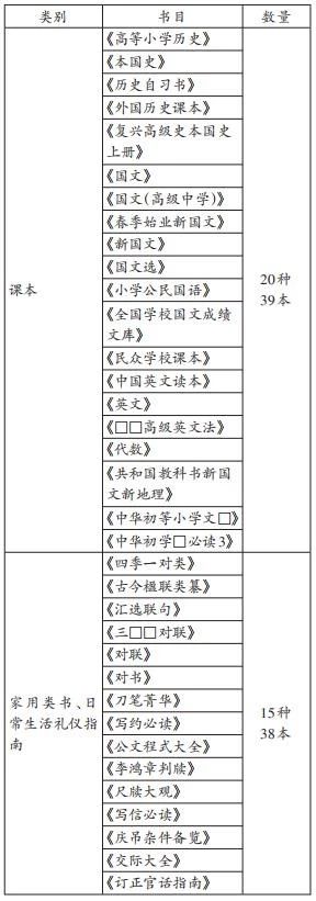 尽管经过集体化时期的几次政治运动,大量乡村社会中的书籍已经无法目睹其真容,不过通过档案中的记录,以及被乡民保留至今的书籍,我们仍可一探乡村社会中存在哪些“旧书”,以及它们与日常生活之间的关系。在“文革”初期的“破四旧”运动中,Z大队有二十余人将家中所藏的书籍上缴至队部,这些缴交图书的明细被制作成清单存档。清单笔迹较为潦草,而且有不少书名亦有抄录舛误之处,由此看来其录入者的文化程度应当较为有限,这也使得我们很难完全复原书单的内容。经过整理,大致可以确定这批书籍的总数至少有148种、428册。(见表1)