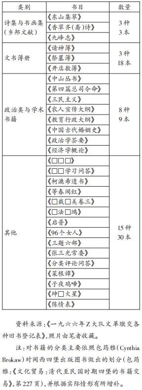 因此,很显然地,由于更多有实用价值的书籍被乡民以各种方法藏匿起来,这份书单中列出的书籍,也仅仅是该地区存在书籍的一部分。而那些被藏匿起来的书籍,无疑有着更为重要的意义。在1966年10月底T公社对四类分子家中进行的搜查中,从某“坏分子”家中搜出“反动书籍”3本、“变天账”13本、族谱1本、迷信书籍2本,以及田契10包、杀猪账簿3本;从某“伪保长”家中搜出“反动书籍”26本、“变天账”5本、旧相片3张,以及田契若干;从某“伪政府官员”家中搜出“反动书籍”40本、“变天账”15本、族谱2本、旧数簿22本、旧药书32本。可见乡民藏匿的书籍以文书簿册(契约、账簿、族谱)和日用类书为主。如果这些人藏匿书籍的行为可以代表乡民对待书籍的一般态度,那么似乎可以证明,与乡民切身利益和日常生活息息相关的文书簿册和日用类书的重要性。