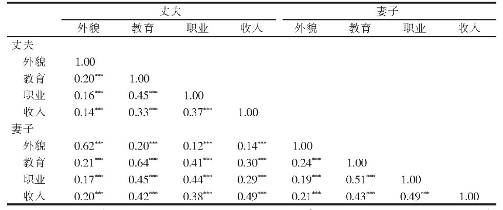 表 2 夫妇外貌与地位指标间的双变量相关关系