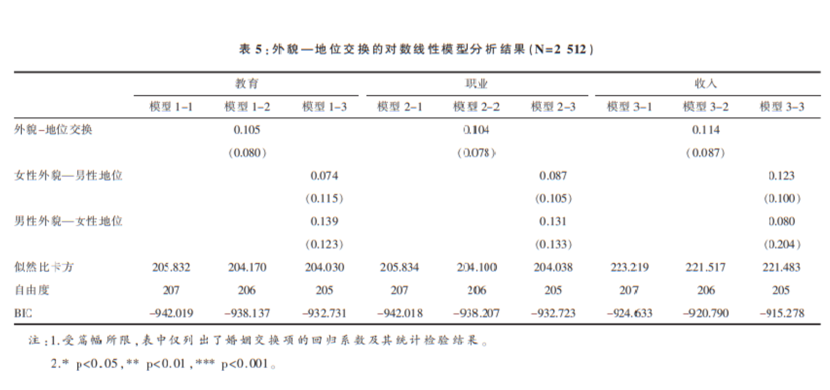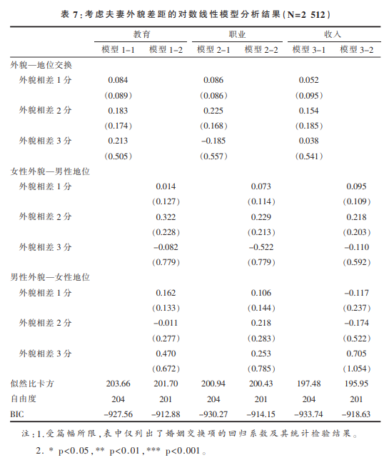 除了外貌—地位交换,本研究还使用对数线性模型分析了不同地位指标间是否存在婚姻交换,这些模型的设定方法与外貌—地位交换类似,此处不再赘述。