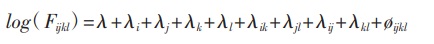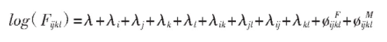 其中,F是单元格的观测频数,它包含四个下标:i代表“丈夫的外貌”,j代表“妻子的外貌”,k代表“丈夫的地位”,l代表“妻子的地位”。Fijkl经过对数变换,可以表示为多个参数线性相加的形式,这也是该模型被称作对数线性模型的原因。