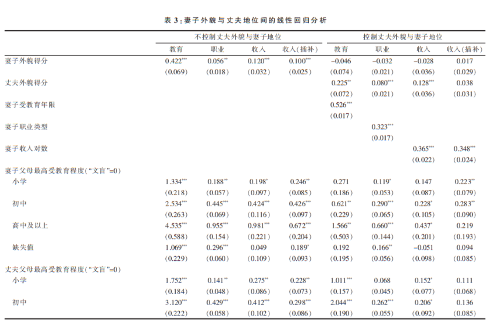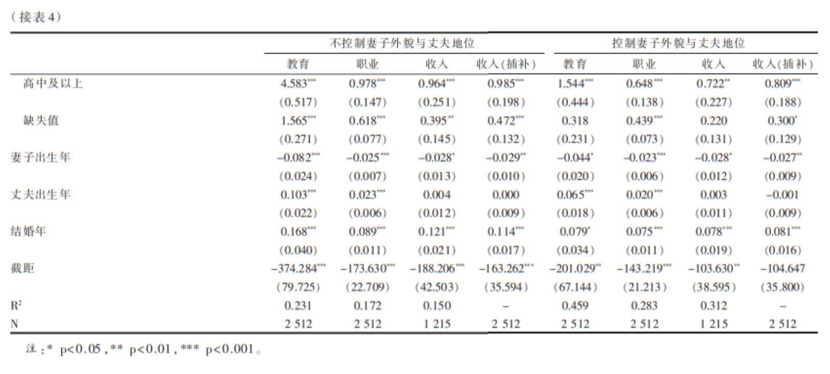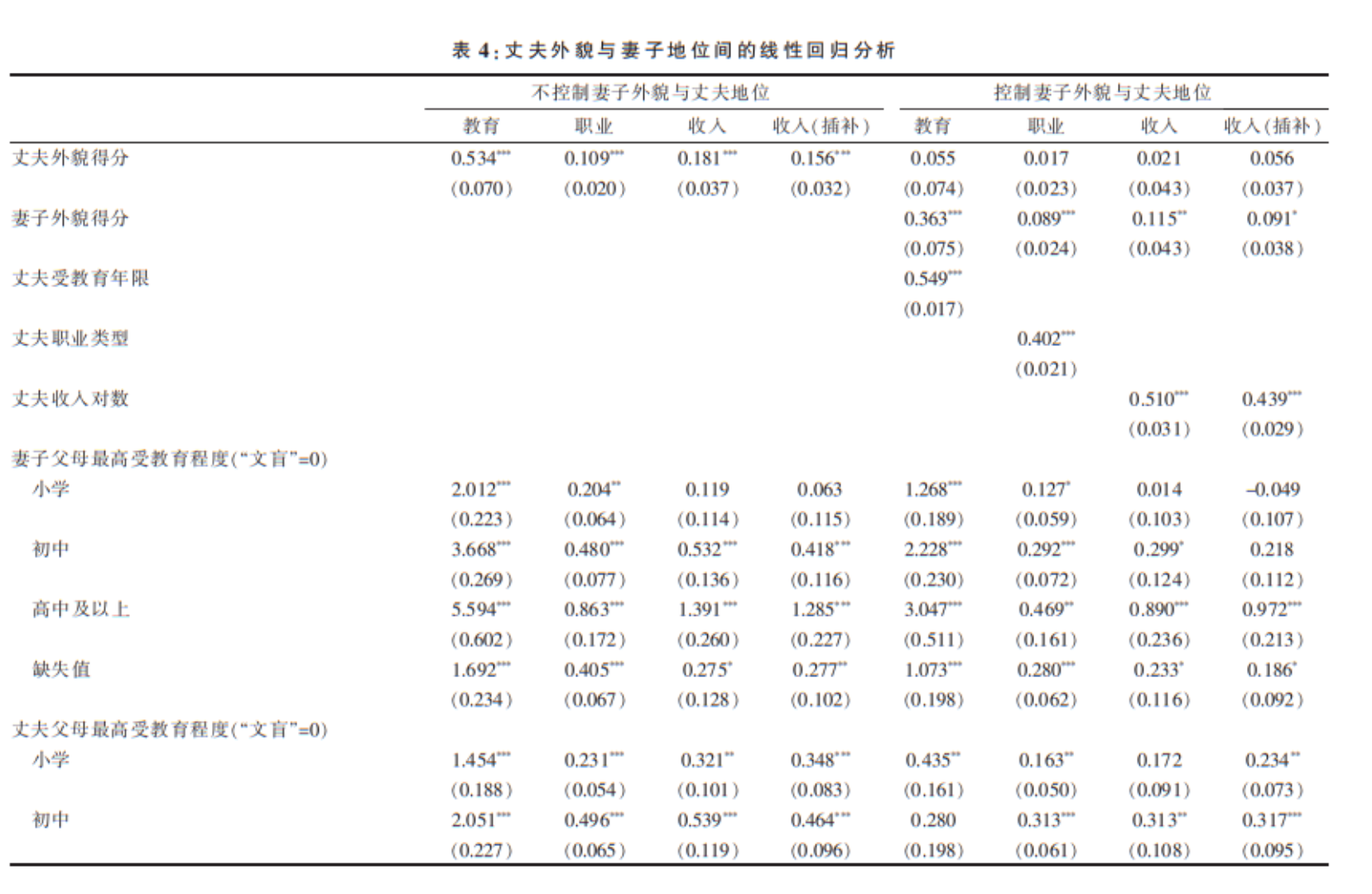 在这一部分,我们将使用线性回归对外貌—地位交换进行更加严格的检验。考虑到妻子外貌与丈夫地位,以及丈夫外貌与妻子地位间的交换可能存在差异,我们分性别拟合了线性回归模型,4模型分析结果参见表 3和表 4。