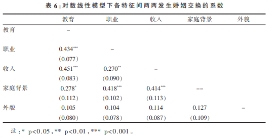 上述对数线性模型分析结果充分说明,外貌—地位交换在中国并不明显。我们认为,导致这一结果的主要原因是外貌与地位是不同质的特征,因而不具有可替代性。相比之下,不同地位指标间的可替代性较强,因而也更可能发生婚姻交换。为了进一步研究不同地位指标间是否存在婚姻交换,我们采用了与之前分析外貌—地位交换时类似的对数线性模型,各特征间两两发生婚姻交换的系数如表 6所示。