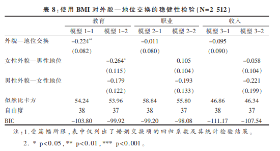 表 8展示的是将BMI分为两组时的分析结果。可以发现,婚姻交换项几乎在所有模型中都不显著。当我们以教育作为地位的测量指标时,该交换项是统计显著的,但其系数是负数,这意味着当夫妻一方的地位较高时,更可能与一个身材较差的对象结婚,这与外貌—地位交换的预期完全相反。导致这一结果的原因超出了本研究的讨论范围,但无论如何,表 8的分析结果说明,用BMI作为外貌的测量无法验证外貌—地位交换。