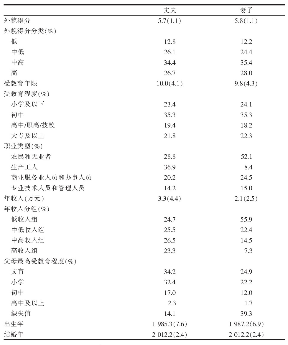 在具体研究时,考虑到夫妻双方的地位和外貌均会随时间发生变化,为了尽可能准确地测量夫妻在结婚时的地位与外貌,我们仅选取了2009年以后结婚的夫妻进行研究,且使用与结婚年份最接近的一轮调查数据作为测量。具体来说,2009至2010年结婚的夫妻数据取自2010年调查,2011至2012年结婚的夫妻数据取自2012年调查,依此类推。如果夫妻在某个测量指标上有缺失,则采用相邻年份的调查数据填补缺失值。1在保留所有匹配成功且在所有变量上数据均完整的夫妻之后,进入分析的样本包含2 512对夫妻。