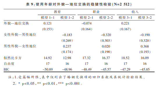 此外,本研究还使用年龄作为外貌的间接测量指标对外貌—地位交换进行了检验。具体来说,本研究用丈夫的年龄减去妻子的年龄,得到夫妇婚龄差,然后将夫妇婚龄差分为三类:4岁及以上(男比女大4岁及以上)、-2岁及以下(女比男大2岁及以上)、-2至4之间(夫妇年龄匹配)。考虑到“年轻”更可能对应“貌美”,如果存在外貌—地位交换,那么当丈夫地位高于妻子时,婚龄差更可能出现在男比女大4岁及以上组;当妻子地位高于丈夫时,婚龄差更可能出现在女比男大2岁及以上组。然而,从表 9的分析结果可以发现,所有婚姻交换项都不显著,因此,以年龄作为外貌的测量指标也无法验证外貌—地位交换。