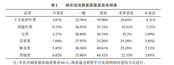 银农场一年约出产59种蔬菜,实行自育苗,并以种植当季蔬菜为原则。不过,59种蔬菜并不是全能受到市场欢迎,快速销售完毕,特别受市场欢迎的是叶菜和一些豆类蔬菜,如菜花、连州菜心、通心菜、荷兰豆等。根据银农场与合作销售平台共同完成的一项针对农场消费者的农场出产蔬菜喜好的随机调查,有69.53%(“喜欢”与“非常喜欢”两个选择项相加,见表1)的消费者喜食十字花科叶菜,而瓜果类蔬菜喜食者只有60.49%,如果考虑瓜果类蔬菜与叶菜产季不同,瓜果类蔬菜喜食者比例是不算高的。在这其中,荷兰豆的喜食比例高达72.72%。在这种消费需求下,如阿锐所说:“种植计划和安排主要是按市场决定。一是根据平台的订购量,二是市场的需求。像菜花、西兰花、迟菜心这些比较受欢迎,那就多种一些······”因此,银农场的整个种植计划和种植安排,基本上都按市场的需求进行。