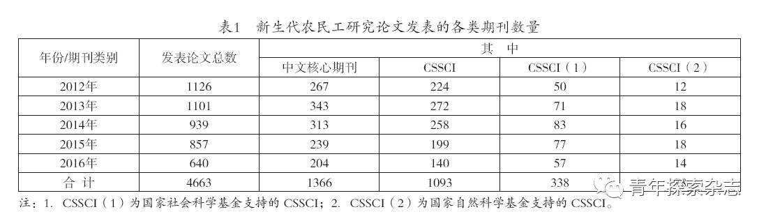 笔者在对中国知网近五年(2012年至2016年)来的文献统计中发现,仅关于新生代农民工问题研究的论文就有4663篇,其中来自北大核心期刊论文有1366篇、CSSCI的有1093篇。在这1093篇CSSCI的论文中,有416篇获国家社会科学基金或国家自然科学基金资助,其中国家社科基金资助的有338篇,国家自然科学基金资助的有78篇(见表1)。