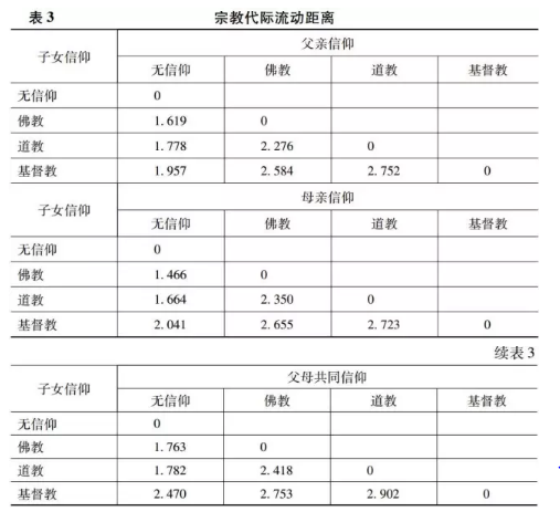 根据相关文献(Parkman &Sawyer, 1967;Mueller, 1971),表3计算了宗教代际信仰变动的距离,结果表明:无论是基于父亲、母亲抑或父母共同的宗教信仰,宗教间的距离都呈现出类似的形态,即对无信仰而言,相似度由小到大的宗教分别为佛教、道教、基督教;对佛教而言,这一顺序为无信仰、道教、基督教;对道教而言,这一顺序为无信仰、佛教、基督教;对于基督教而言,这一顺序为无信仰、佛教、道教。由此,我们发现无信仰这一宗教偏好与其他的宗教信仰之间的距离最近,佛教居于次位,而后是道教,基督教与其他的宗教信仰的距离最远、相似性最低。因此,在宗教信仰距离连续体上,趋近于最小值一端的是无宗教信仰,趋近于最大值一端的是基督教信仰,佛教与道教居于中间。