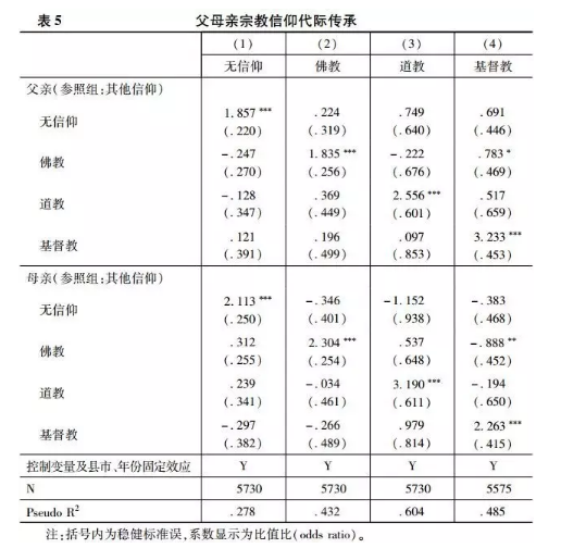 其次,父母双方在宗教代际传递上呈现出一定的差异模式。从整体上看,母亲的影响力高于父亲。这变相支持了社会学习理论中学习强度与宗教习得之间的关系,因为母亲往往与孩子互动较多。但与社会学习理论的预测有所不同,表5的结果表明,我们比较父母的角色时还需考虑更复杂的信仰要素。例如,在传递基督教上,父亲的传递能力就显著高于母亲;而在传递道教、佛教上,母亲又获得了更大的优势。那么,如何解释父母角色与具体宗教间的关联?